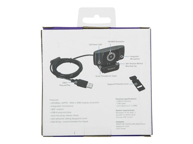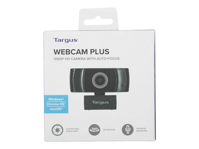 Connect to the world in Full HD with the Targus Webcam Plus Full HD 1080p Webcam with Auto Focus. A step-up from typical laptop webcams thanks to its bright aperture lens, CMOS censor and auto lighting correction all working in unison to ensure high-quality Full HD video even in less than optimal light. Plus auto focusing technology keeps you sharp in frame at all times, so you no longer appear to be a blurred, fuzzy avatar on screen, ideal for home working professionals that demands high-quality video conferencing.