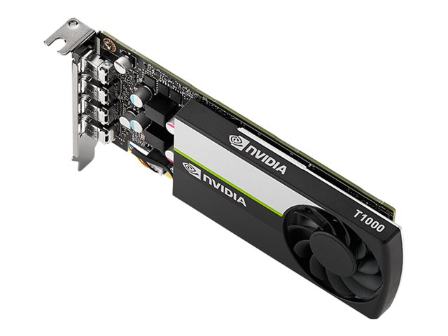 The NVIDIA T1000, built on the NVIDIA Turing GPU architecture, is a powerful, low profile solution that delivers the full-size features, performance and capabilities required by demanding professional applications in a compact graphics card. Featuring 896 CUDA cores and 4GB of GDDR6 memory, the T1000 enables professionals to tackle multi-app workflows, from 3D modeling to video editing. Support for up to four 5K displays gives you the expansive visual workspace to view your work in stunning detail.