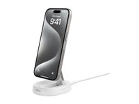 The Belkin BoostCharge Pro wireless charging stand is tailored for the modern cellular phone user, offering efficient wireless charging with its 15 watts of power. It features a convertible design for use as both a pad and a stand, suiting various charging needs. The stand ensures your device remains securely in place thanks to its magnetic fixation and non-slip base. Made from 60% recycled post-consumer plastic, the BoostCharge Pro is an eco-friendly choice that does not compromise on quality or performance. It complies with FCC, Qi, REACH, RoHS, and USB-IF standards, demonstrating its commitment to safety and high-quality standards.