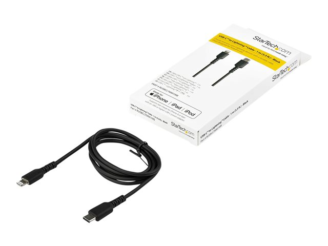 StarTech.com 3 ft(1m) Durable Black USB-C to Lightning Cable, Heavy Duty Rugged Aramid Fiber USB Type C to Lightning Charger/Sync Power Cord, Apple MFi Certified iPad/iPhone 12 Pro Max - iPhone 7/8/11/11 Pro - Lightning-kabel - Lightning hann til USB-C hann - 1 m - svart RUSBCLTMM1MB