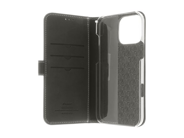 Insmat Exclusive - Lommebok for mobiltelefon - ekte skinn, kartong+papir+aluminiumsfolie, polykarbonat (PC), bomullssting - svart - for Apple iPhone 16 Pro Max 650-3281