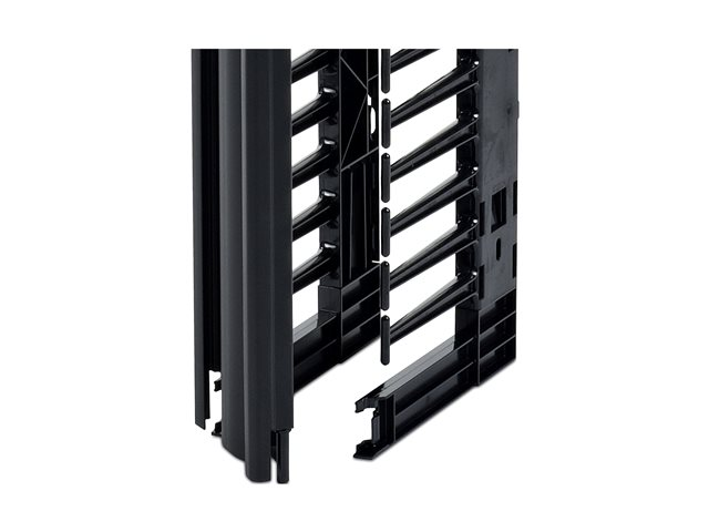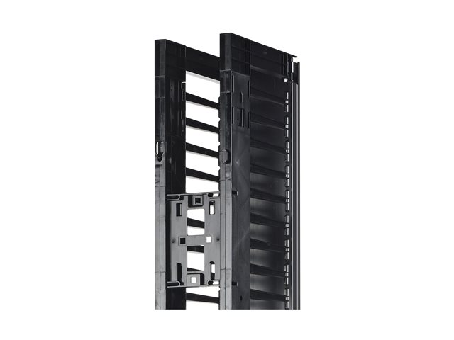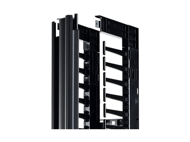 This 6” wide, high capacity vertical cable manager for 2 and 4 Post open frame racks features a single-sided cable channel with multiple internal cable tie-off locations and smooth plastic fingers at 1U increments for organized patching applications.