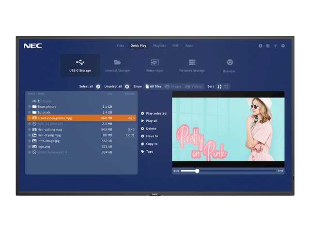 - Everything under control - one single interface is needed to manage both the NEC MediaPlayer and the display directly, via a web-interface or the NEC Display remote control
